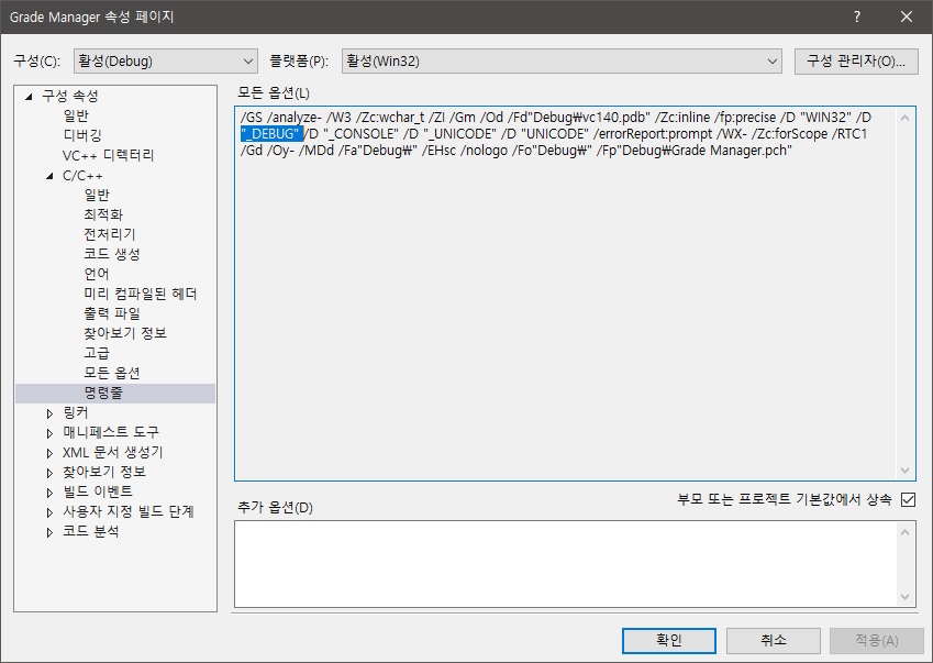 왼쪽의 '구성 속성' → 'C/C++' → '명령줄' 항목을 눌러봅시다. 왼쪽 위 '구성' 부분이 'Debug'로 되어 있어야 합니다. 오른쪽에 보이는 것들이 미리 정의된 항목들입니다. 이 중에서 우리가 이용할 것은 _DEBUG 입니다.